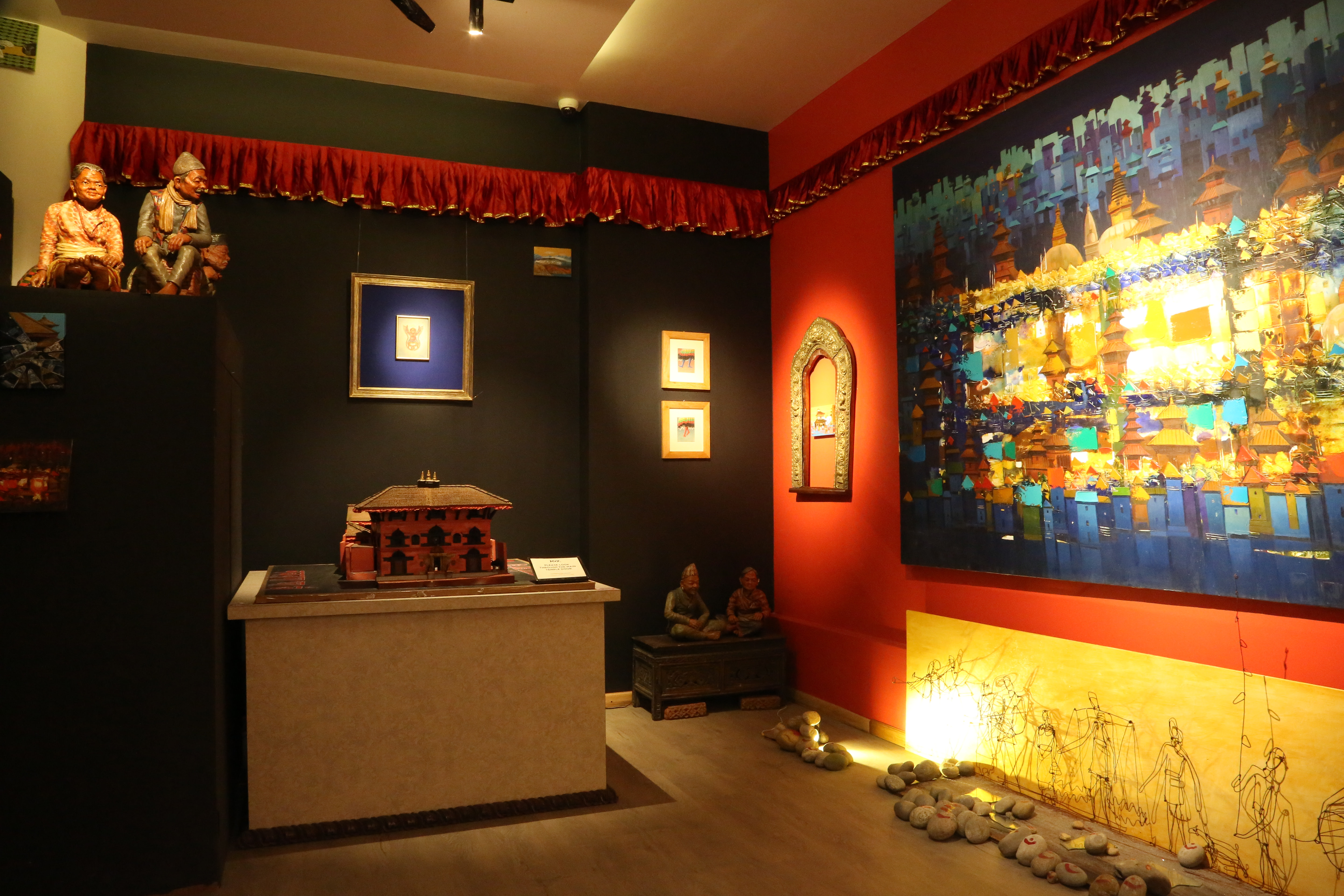 The exhibition features more than 100 artworks by 69 traditional and contemporary modern artists, including Lok Chitrakar, Kiran Manandhar, Prem Man Chitrakar, Raj Prakash Man Tuladhar, Samundra Man Singh Shrestha, Ujay Bajracharya, Uma Shankar Shah, Madan Chitrakar, Rajani Sinkhwal, Pramila Bajracharya, Seem Sharma Shah, Shailee Bajraxharya, Swarnim Shakya, Sushila Singh and more. The museum’s walls are segmented and curated accordingly, narrating different aspects of life.